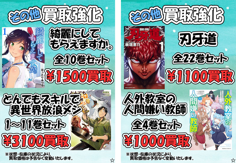 漫画・書籍・本の買取企画はどのジャンルよりも買取企画の変更が多いです。お店、またはホームページで買取企画を確認してみましょう!お得な買取企画が見つかるかもしれません!